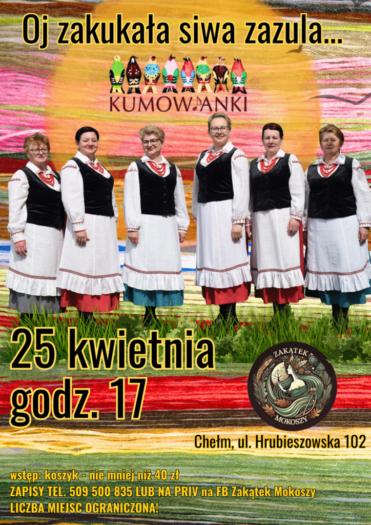 Zapraszamy na wyjątkowy koncert. To będzie muzyka ludowa w najczystszej postaci. Piękne pieśni a capella, spisane ze starych śpiewników i wykonywane zgodnie z wielowiekową tradycją. Zespół śpiewaczy Kumowianki to perła Lubelszczyzny, jeśli chodzi o muzykę ludową.