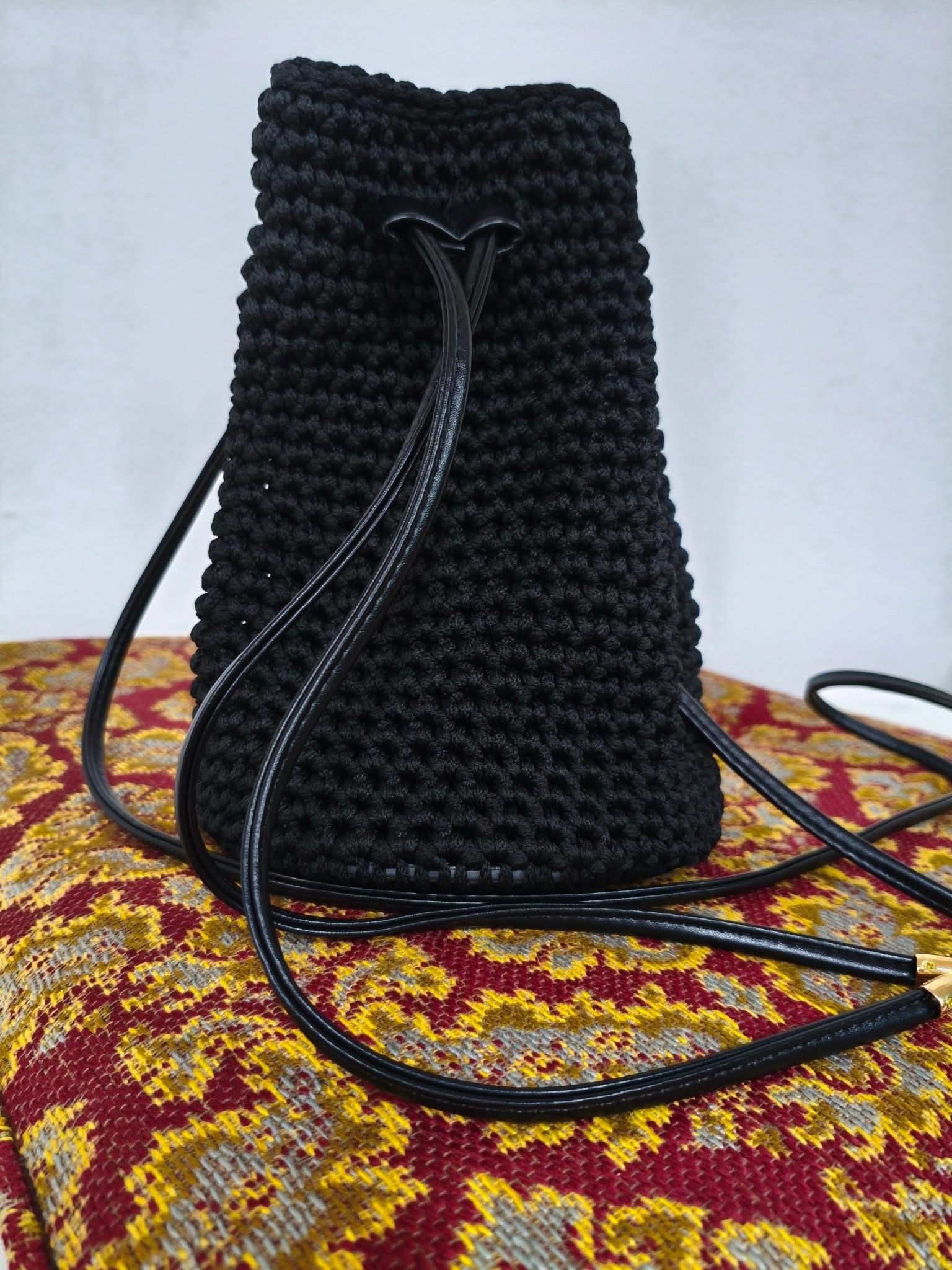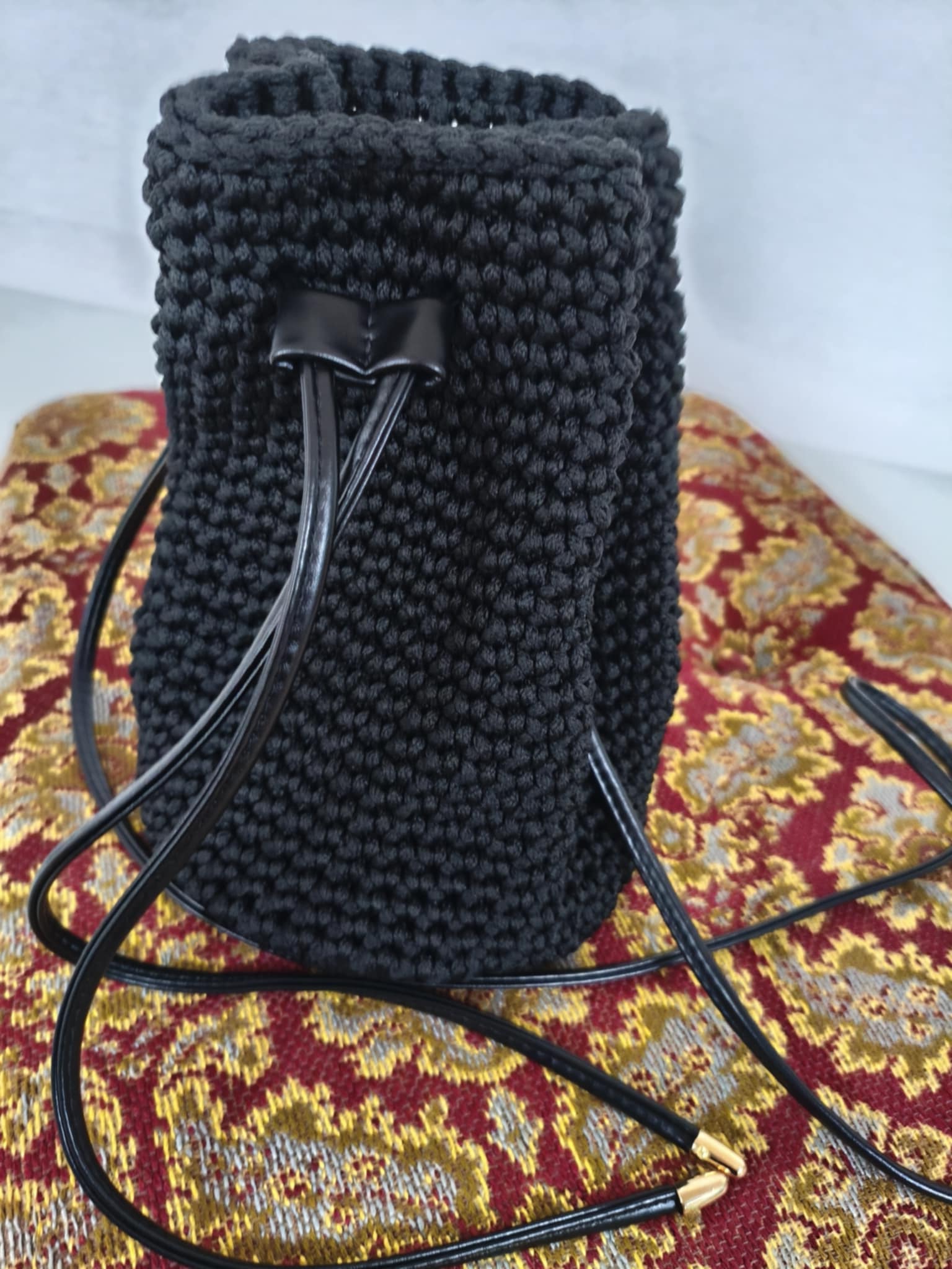 Głęboka czerń, piękny splot, perfekcyjne wykończenie. Troki z materiału imitującego skórę w kolorze czarnym, ze złotymi końcówkami. Długi pasek, podszewka, torebka na ramię.