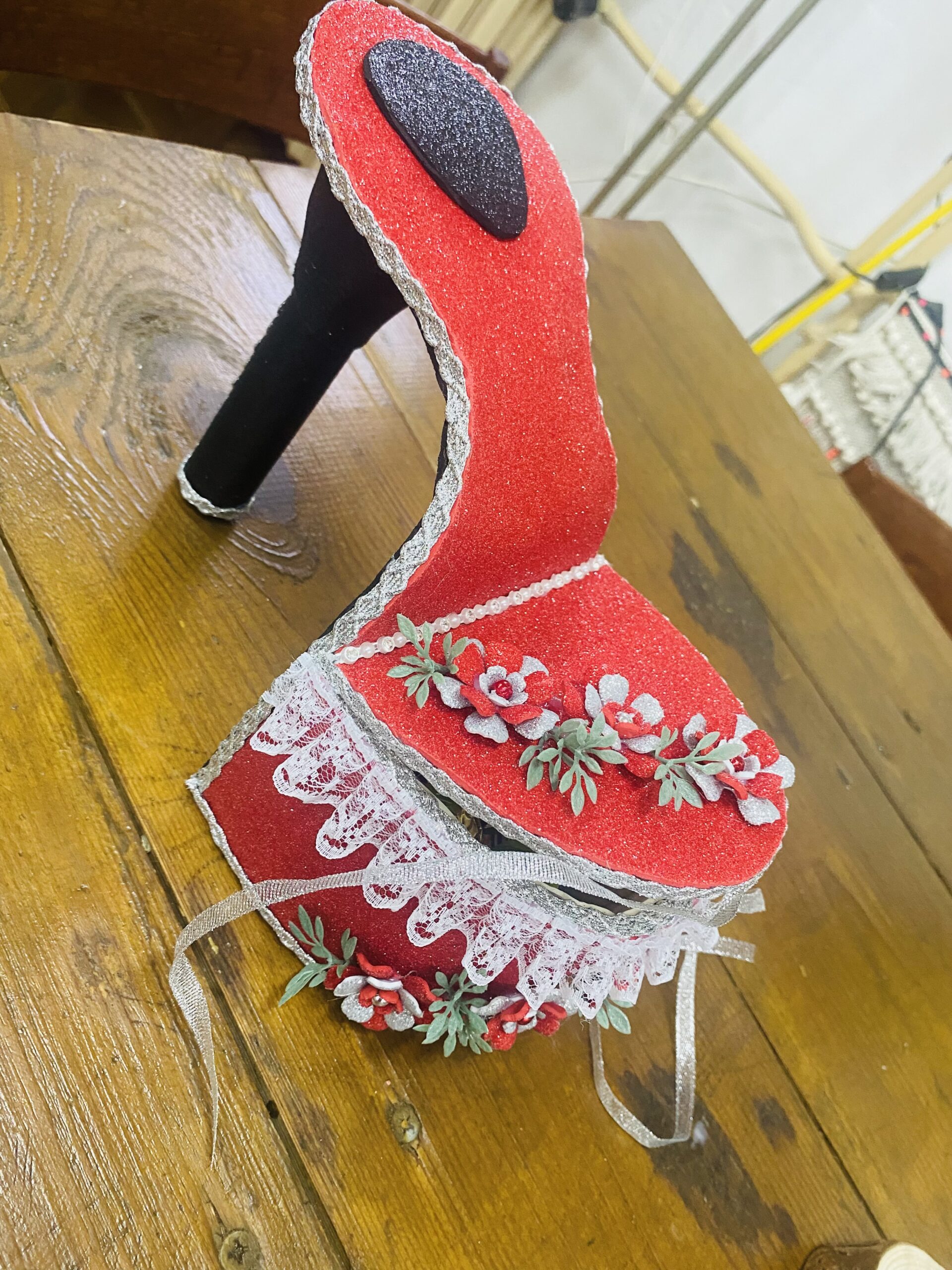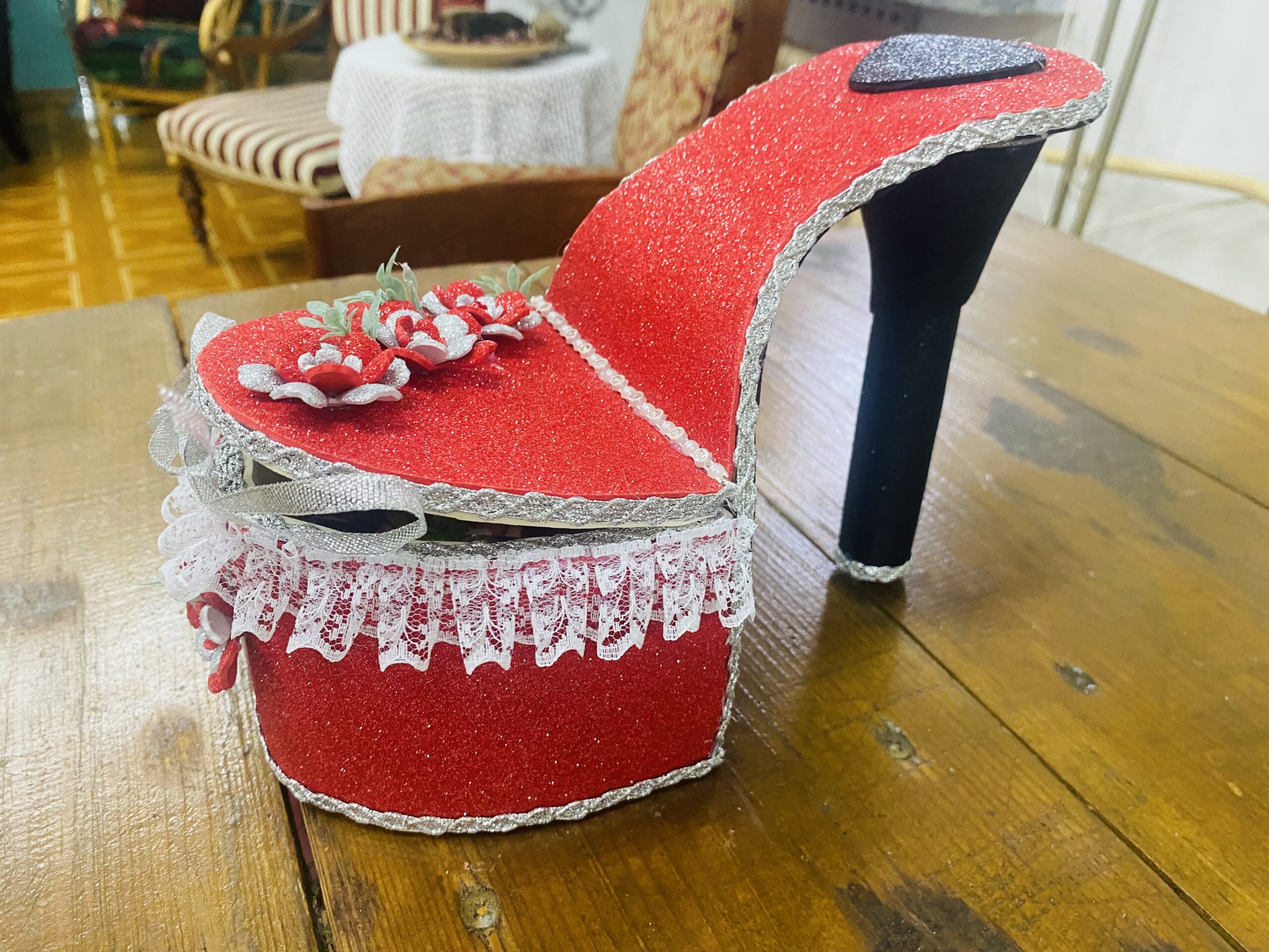Ręcznie wykonane pudełko w kształcie kobiecego pantofelka na obcasie — idealne na drobiazgi, biżuterię lub jako nietuzinkowa ozdoba wnętrza.