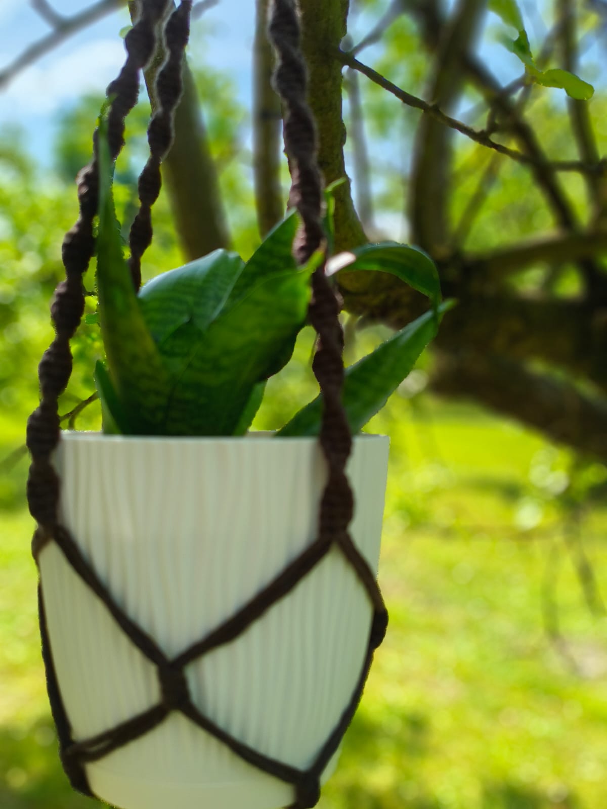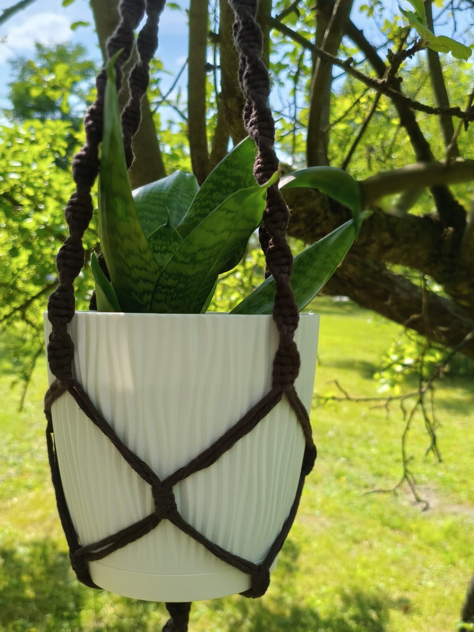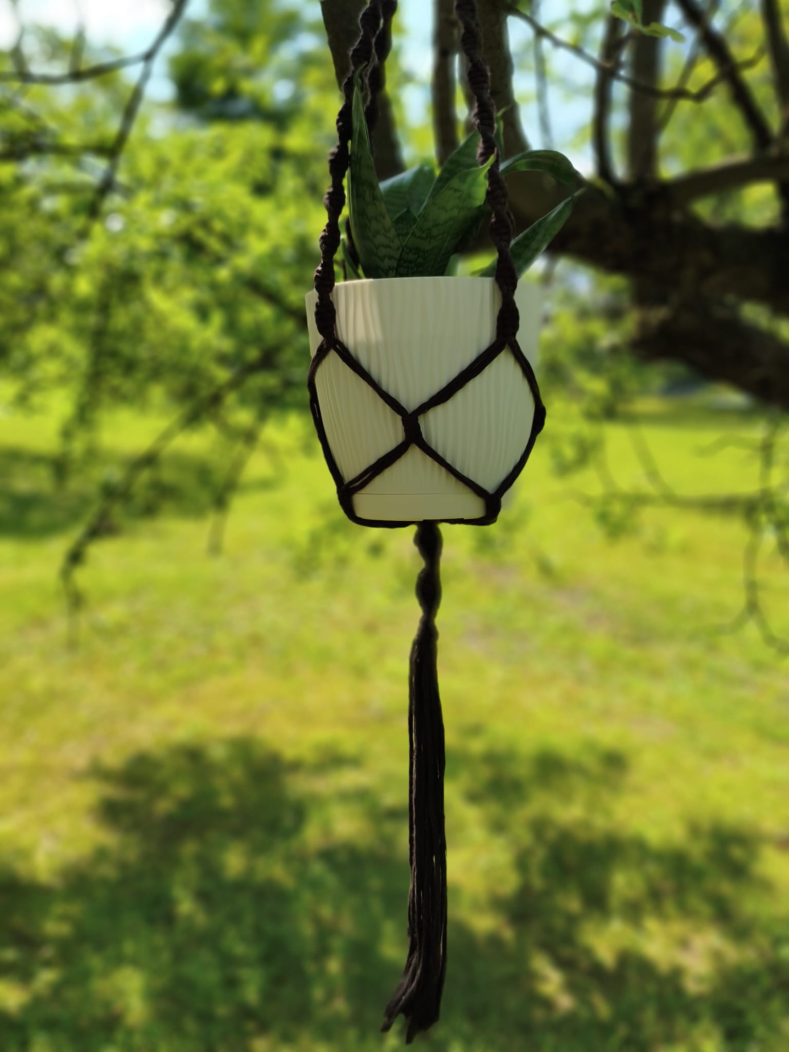 Kwietnik w ciemnym kolorze, ręcznie wyplatany z bawełnianego sznurka. Można zawiesić go na haczyku pod sufitem, w oknie, na ozdobnym haku przy ścianie, w ogrodzie. Pasuje do średniej wielkości doniczki. Prosty, ciekawy wzór, wygląda efektownie i świetnie wygląda w różnych wnętrzach, zarówno tych tradycyjnych, jak i eleganckich.