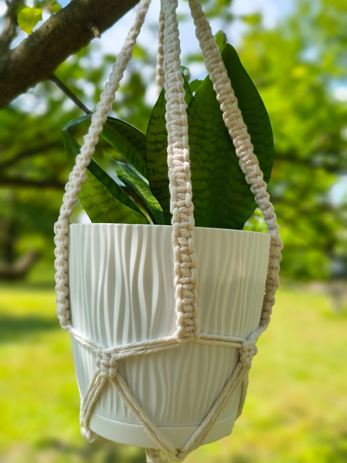 Kwietnik w jasnym kolorze, ręcznie wyplatany z bawełnianego sznurka. Można zawiesić go na haczyku pod sufitem, w oknie, na ozdobnym haku przy ścianie, w ogrodzie. Pasuje do średniej wielkości doniczki. Prosty, ciekawy wzór, wygląda efektownie i świetnie w różnych wnętrzach, zarówno tych tradycyjnych, jak i eleganckich.
