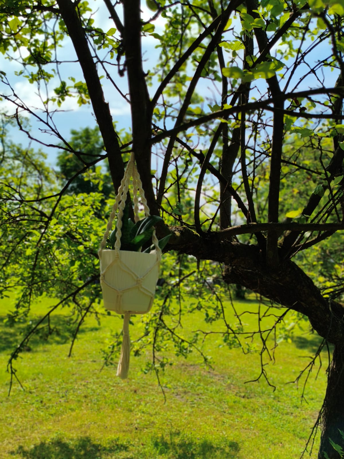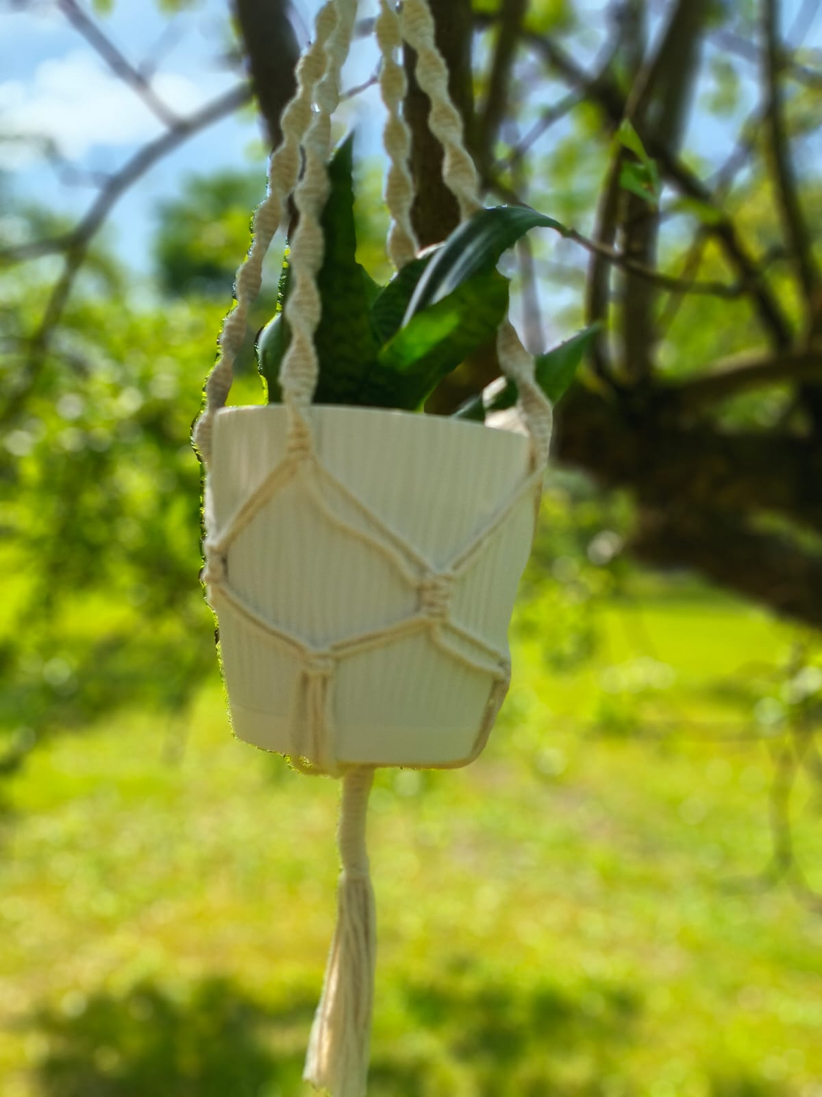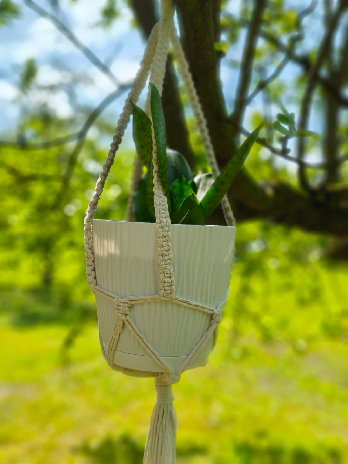 Kwietnik w jasnym kolorze, ręcznie wyplatany z bawełnianego sznurka. Można zawiesić go na haczyku pod sufitem, w oknie, na ozdobnym haku przy ścianie, w ogrodzie. Pasuje do średniej wielkości doniczki. Prosty, ciekawy wzór, wygląda efektownie i pasuje do różnych wnętrz, zarówno tych tradycyjnych, jak i eleganckich.
