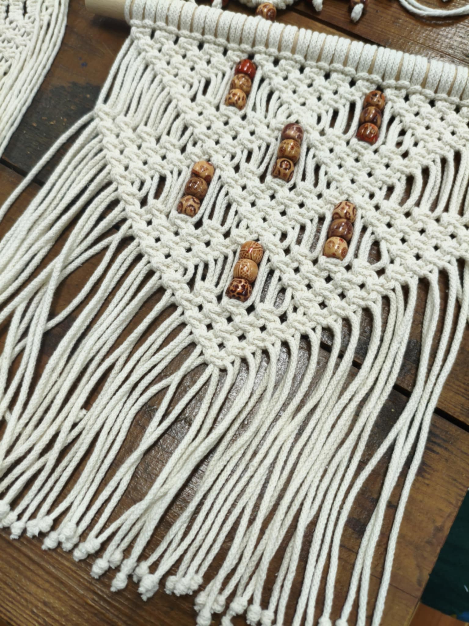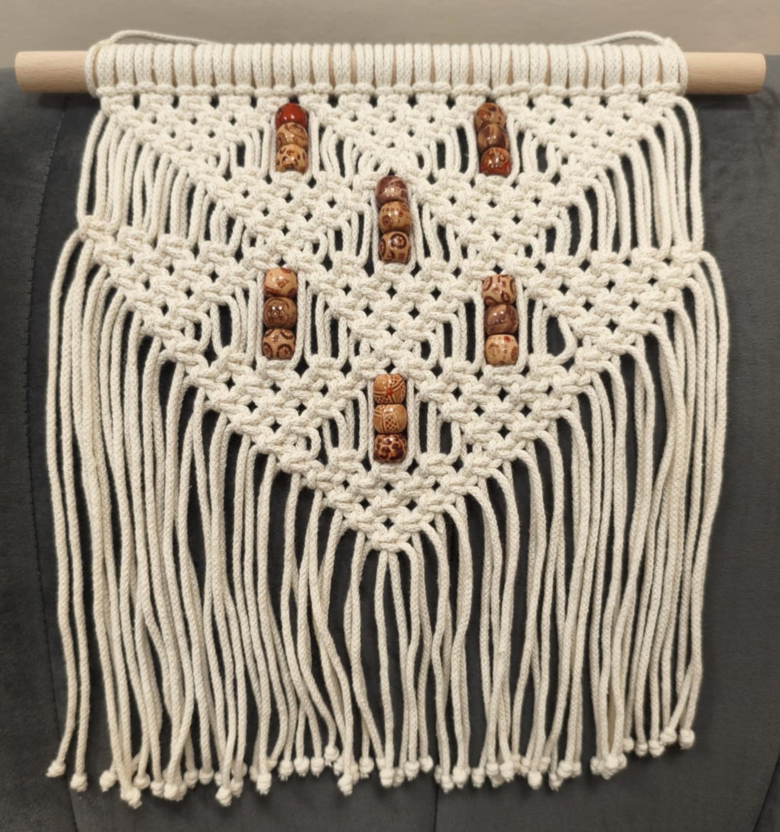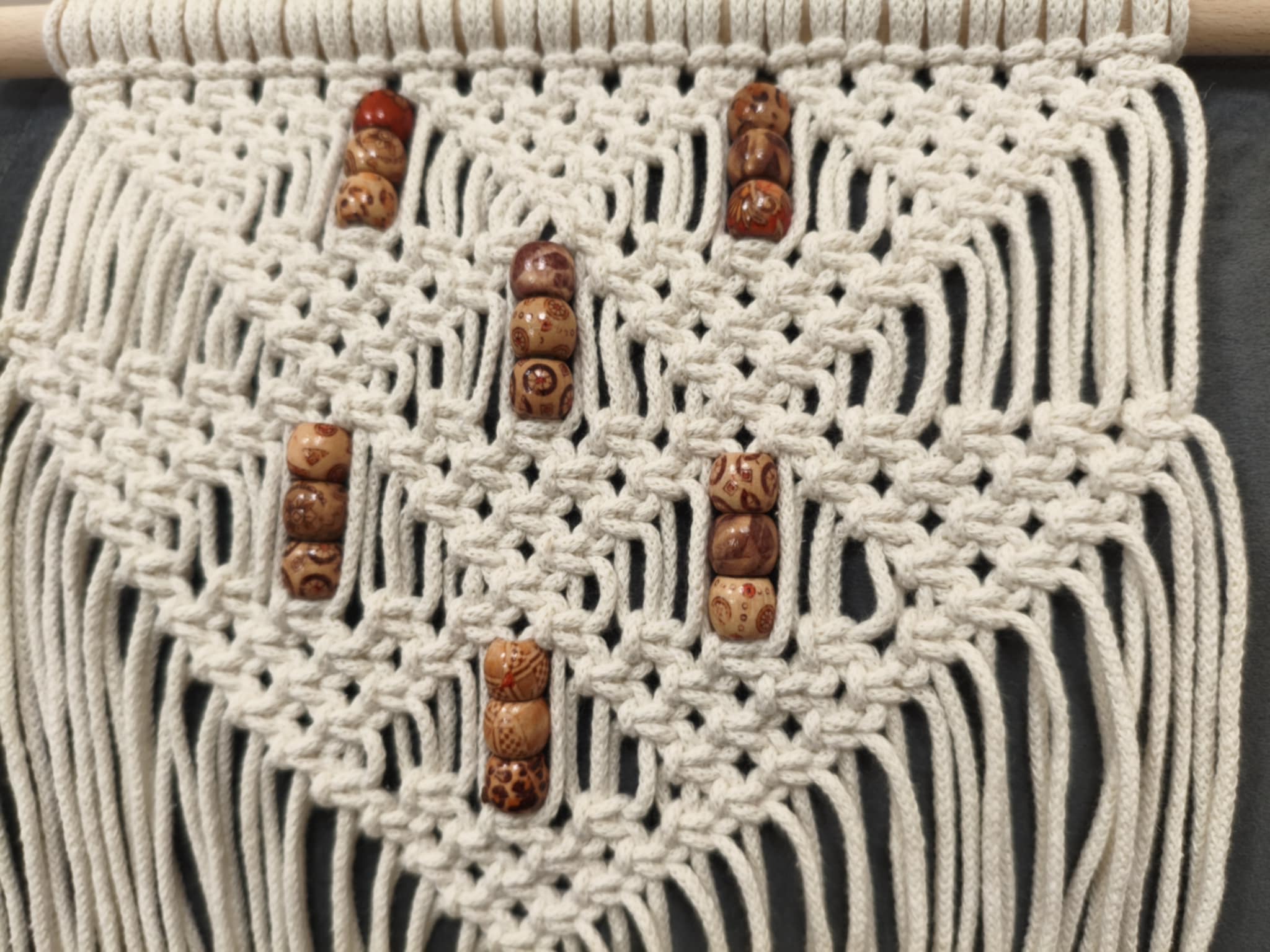 Ozdobna makrama na ścianę w kolorze jasnego ecru. Uroczy i oryginalny element dekoracyjny w stylu boho do ciekawych wnętrz, zarówno do pokoju dziennego, sypialni czy przedpokoju. Wykonana z dbałością o detale, z ozdobnymi drewnianymi koralami.