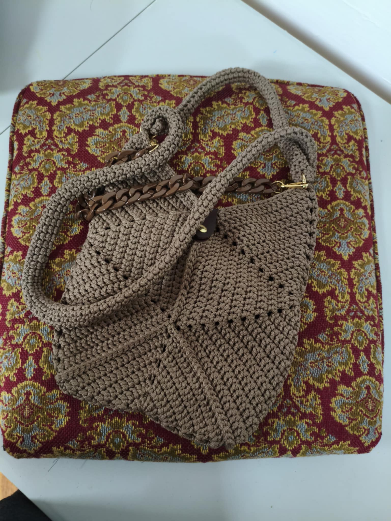 Średniej wielkości torebka z ciekawym, geometrycznym wzorem. Bardzo oryginalna, z długim paskiem i krótkim imitującym łańcuch w kolorze brązowym. Do tego wykończenia w złocie. Jest połączeniem elegancji i naturalnego stylu boho. Idealna na co dzień, do pracy, na spotkanie z przyjaciółmi. Świetnie komponuje się z jeansami i casualowymi stylizacjami.