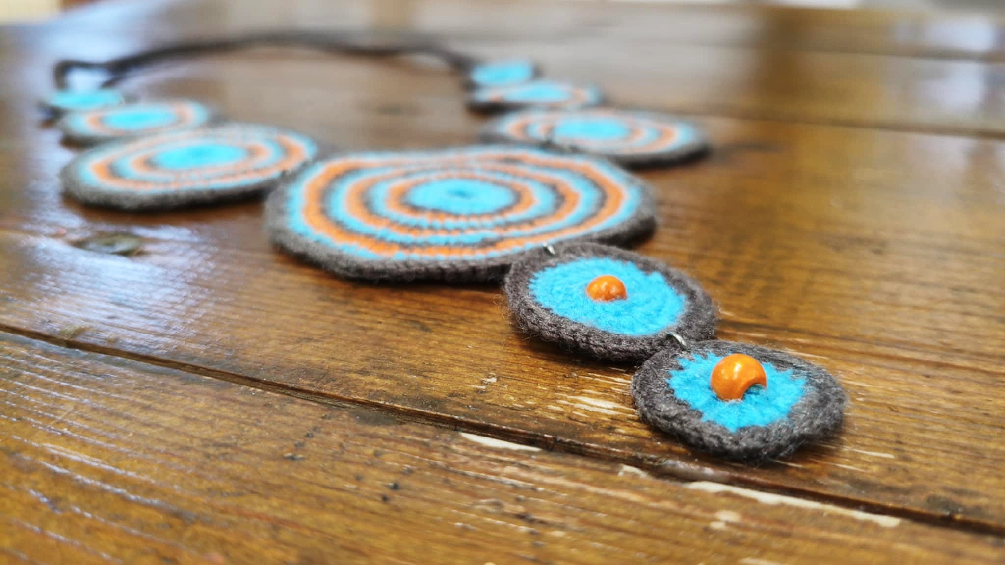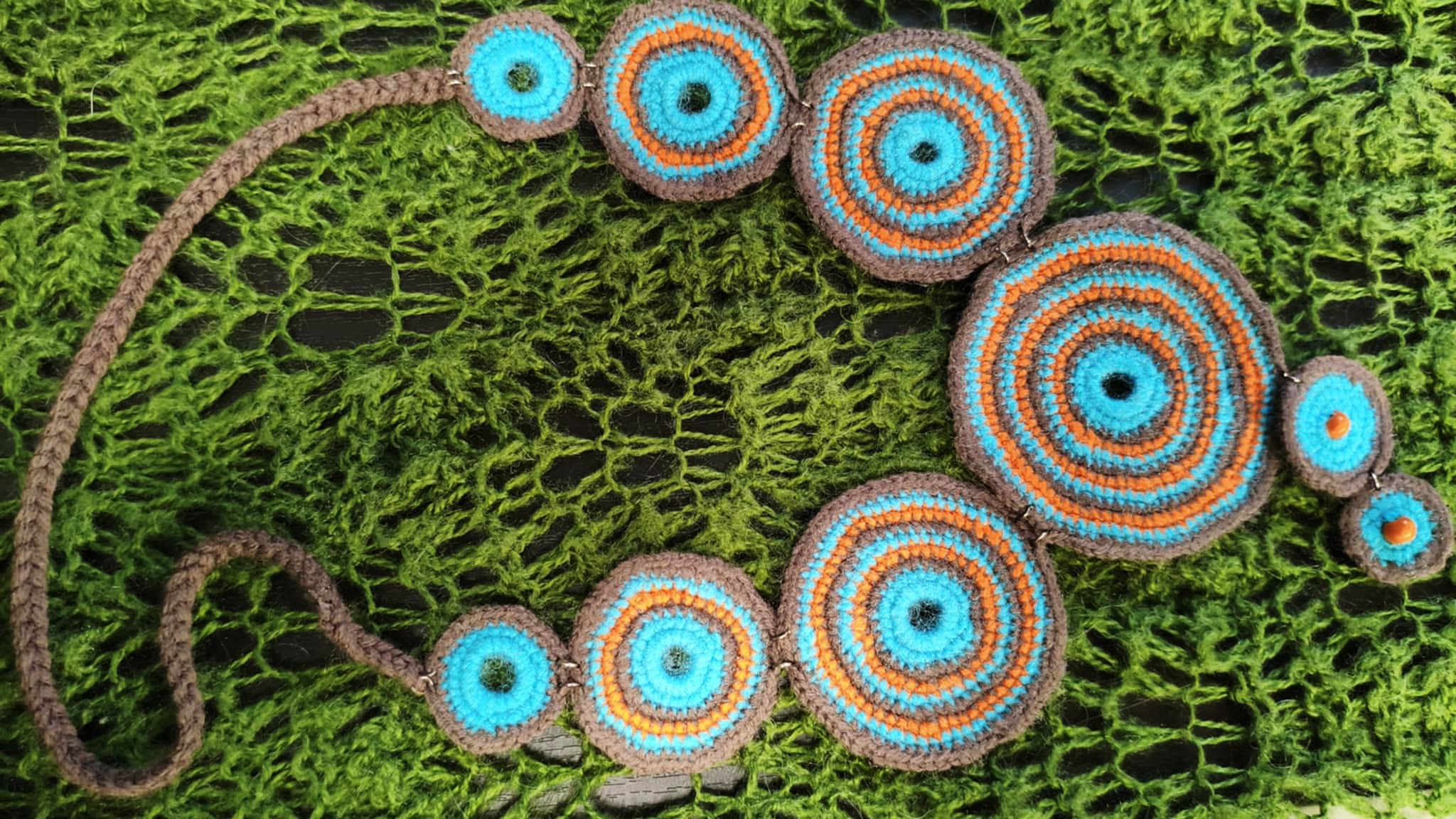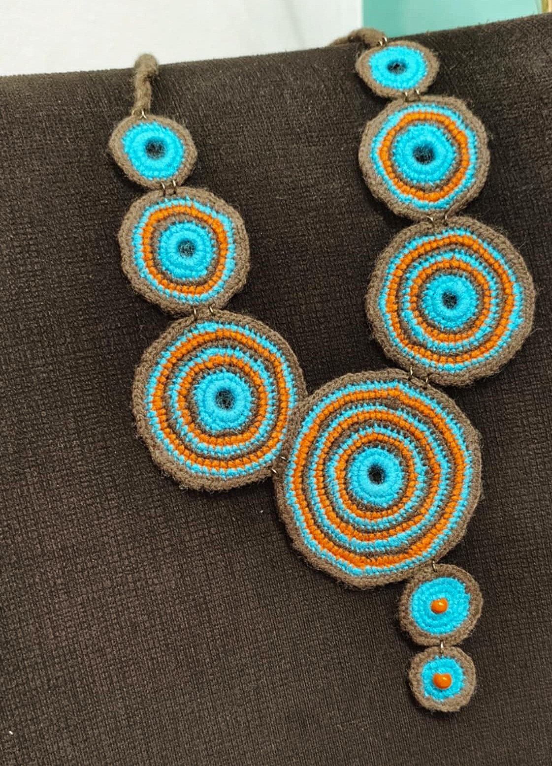 Oryginalny naszyjnik, którego magiczne kółka zwracają uwagę kolorami i wzorem. Zaprojektowany przez naszą twórczynię i wykonany z dbałością o każdy szczegół. Składa się z aż dziewięciu elementów w przemyślanej kolorystyce. Projekt własny autorki.
