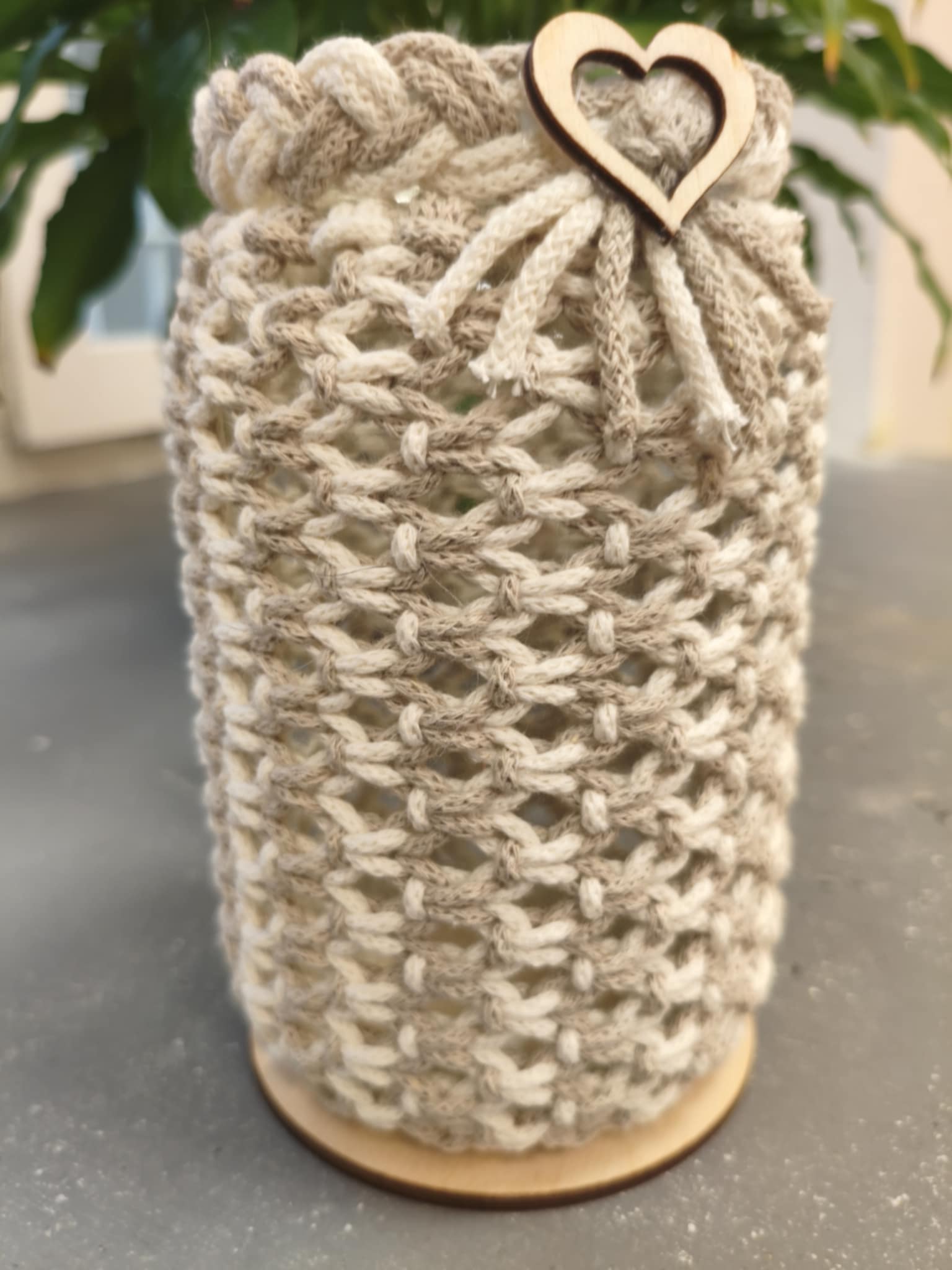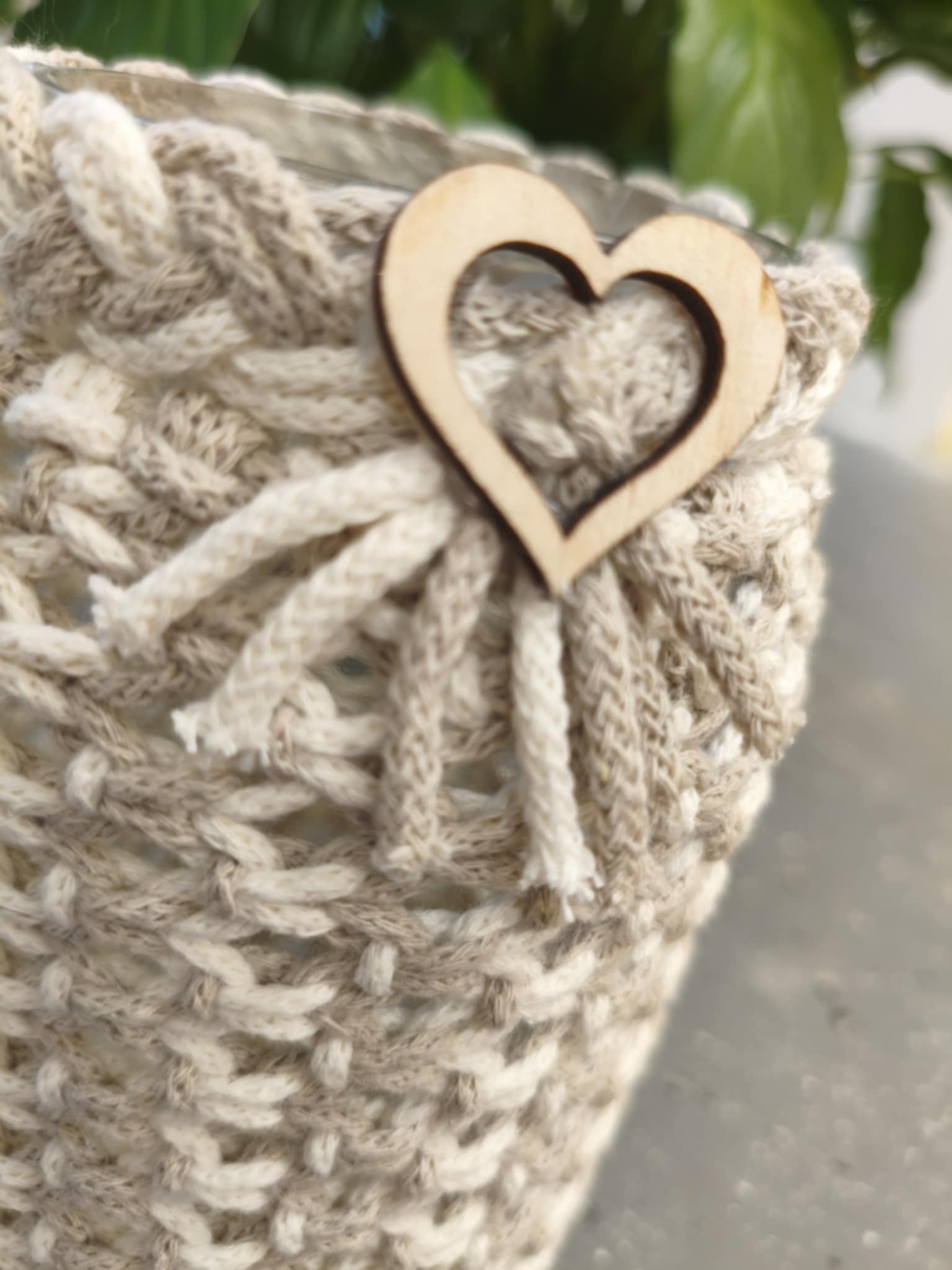 Ozdobny pojemnik wielkości litrowego słoika. Jasny splot – połączenie dwóch kolorów, drewniane elementy, w stylu boho. Idealny do biura, ale też do kuchni, sypialni, łazienki. Nada oryginalności wnętrzu. Wykonany z precyzją.